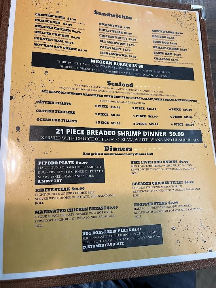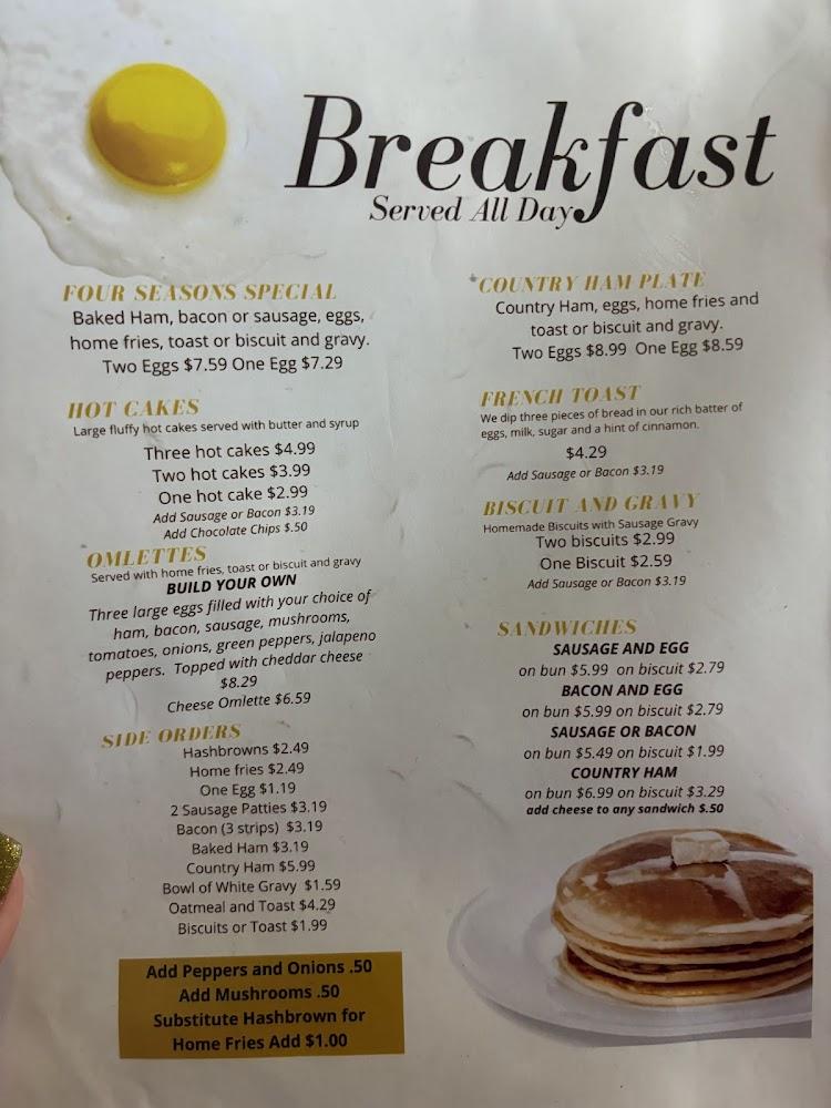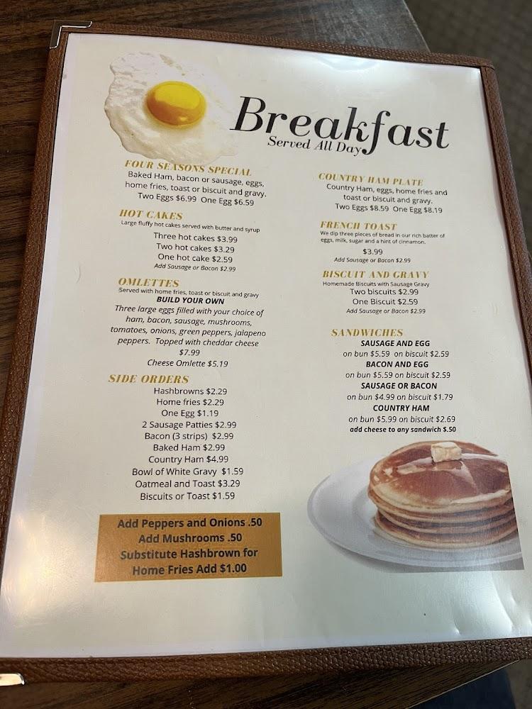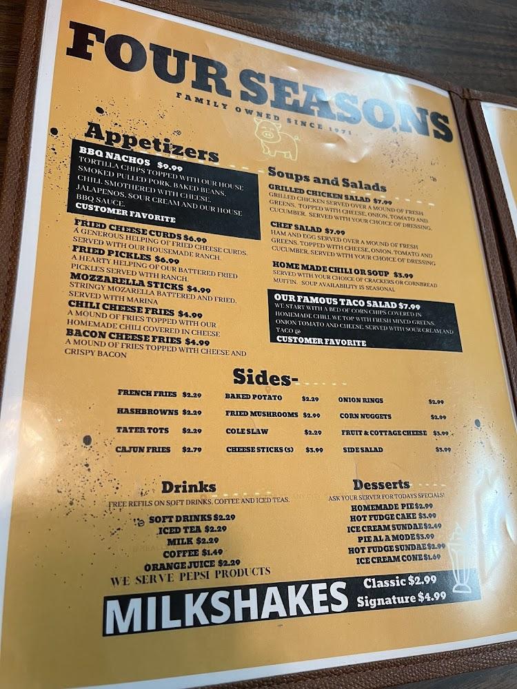 Four Seasons offers a diverse menu focusing on simple, traditional dishes. Breakfast options include custom omelettes and classic sandwiches like sausage and egg. Lunch and dinner menus feature hearty plates like ribeye steak and pit BBQ. Appetizers such as fried pickles and cheese curds tempt early afternoon diners. Desserts like sundaes and homemade pie are sweet endings to any meal, providing a comforting touch. A selection of healthy options and fresh salads also satisfies those seeking lighter fare.